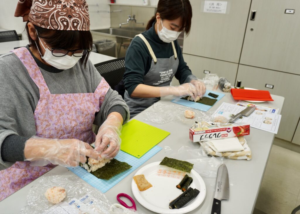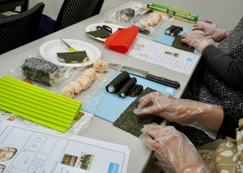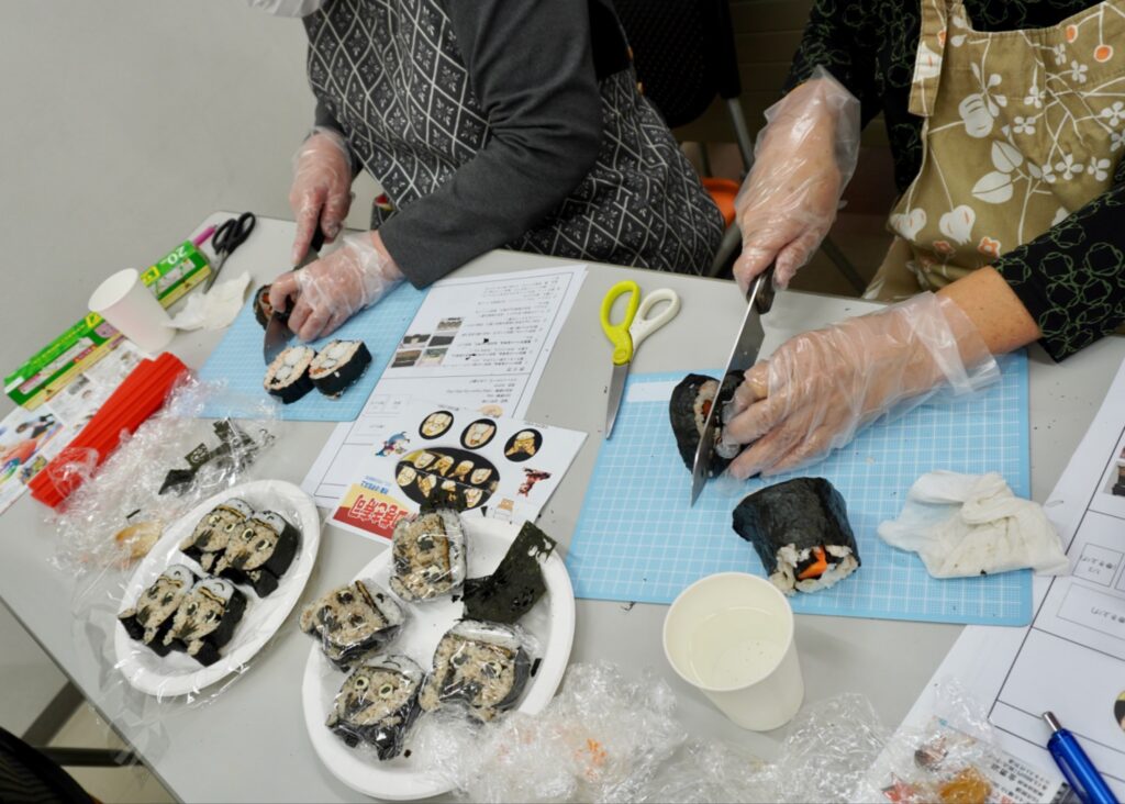 おかもと先生はご飯の乗せ方や巻き方、切る際のコツを説明し、参加者はそれを参考に作業を進めました。初めての人がほとんどの中、それぞれ個性あふれるデコ巻き寿司が完成しました。
