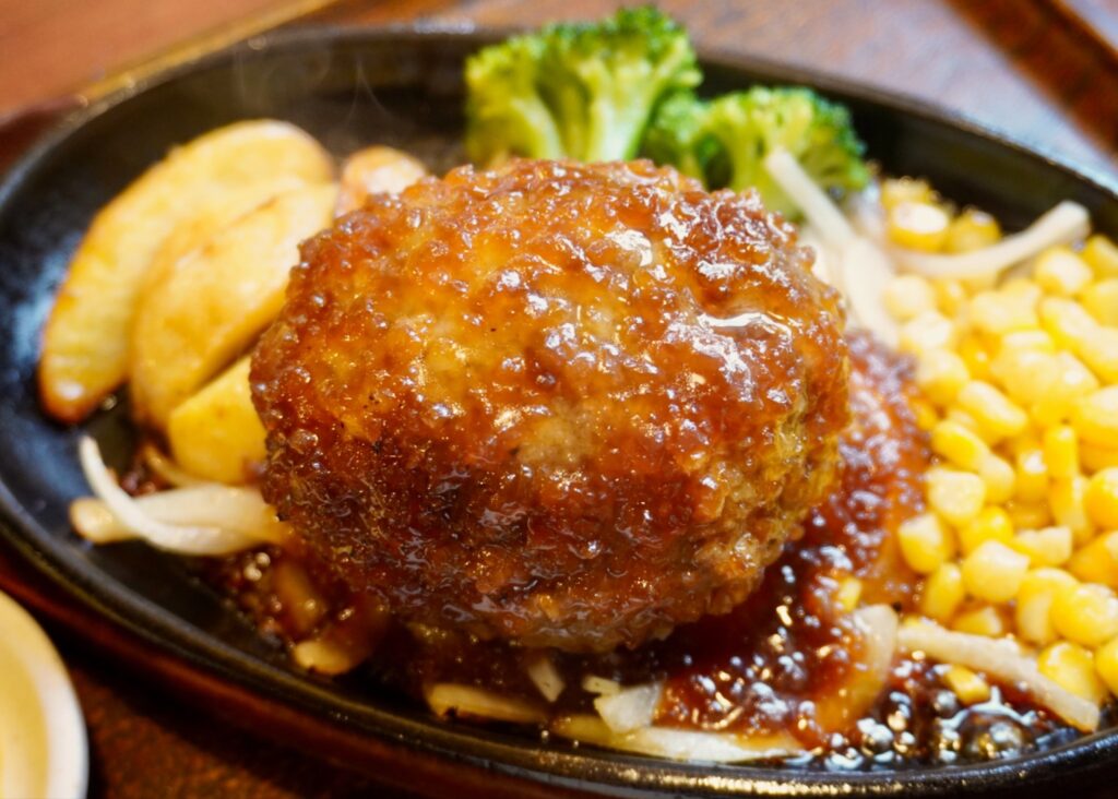今では、一番人気メニューとなった「粗挽きビーフハンバーグステーキ」は、牛肉と玉ねぎだけを使ったシンプルな味わいで、熱々の鉄板で提供されます。260グラムのボリュームで、黒こしょうが効いた満足感ある一品。また、目玉焼きやチーズのトッピングが選べ、自分好みのハンバーグが味わえるのも魅力の一つ。定食には赤だし、ご飯、漬物が付き、お得感満載です。