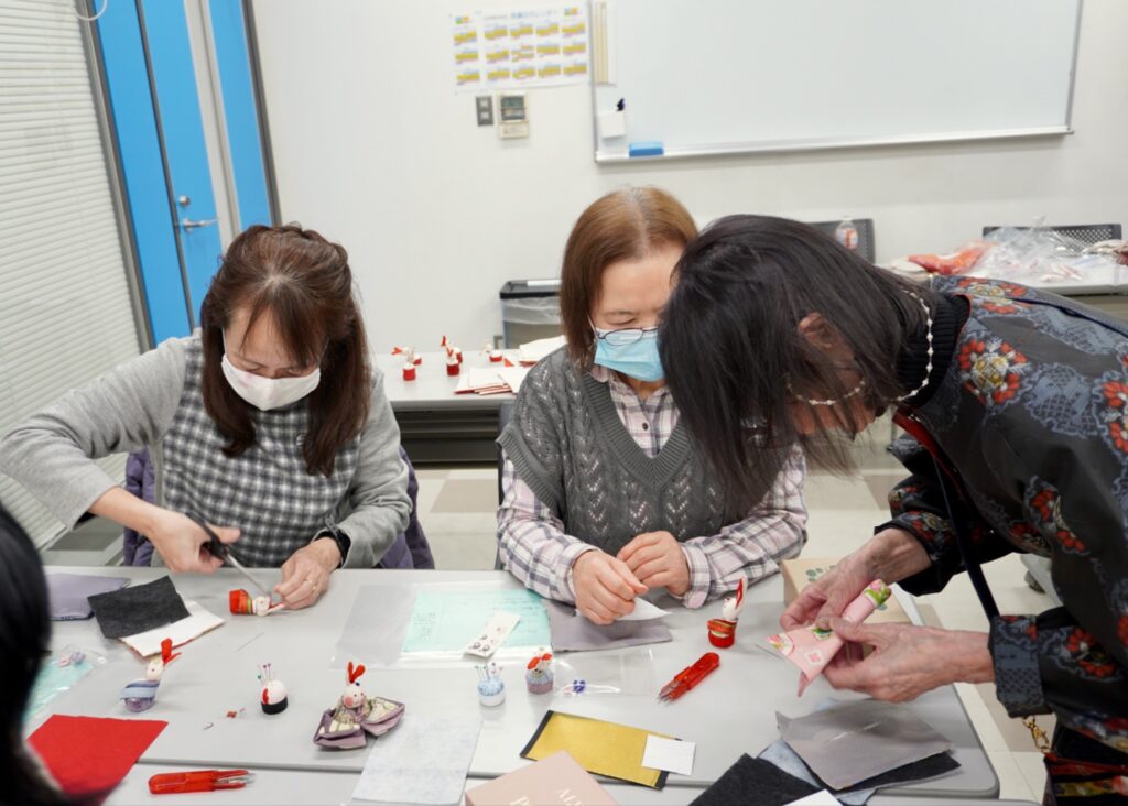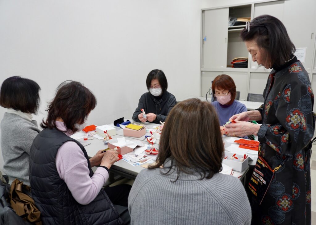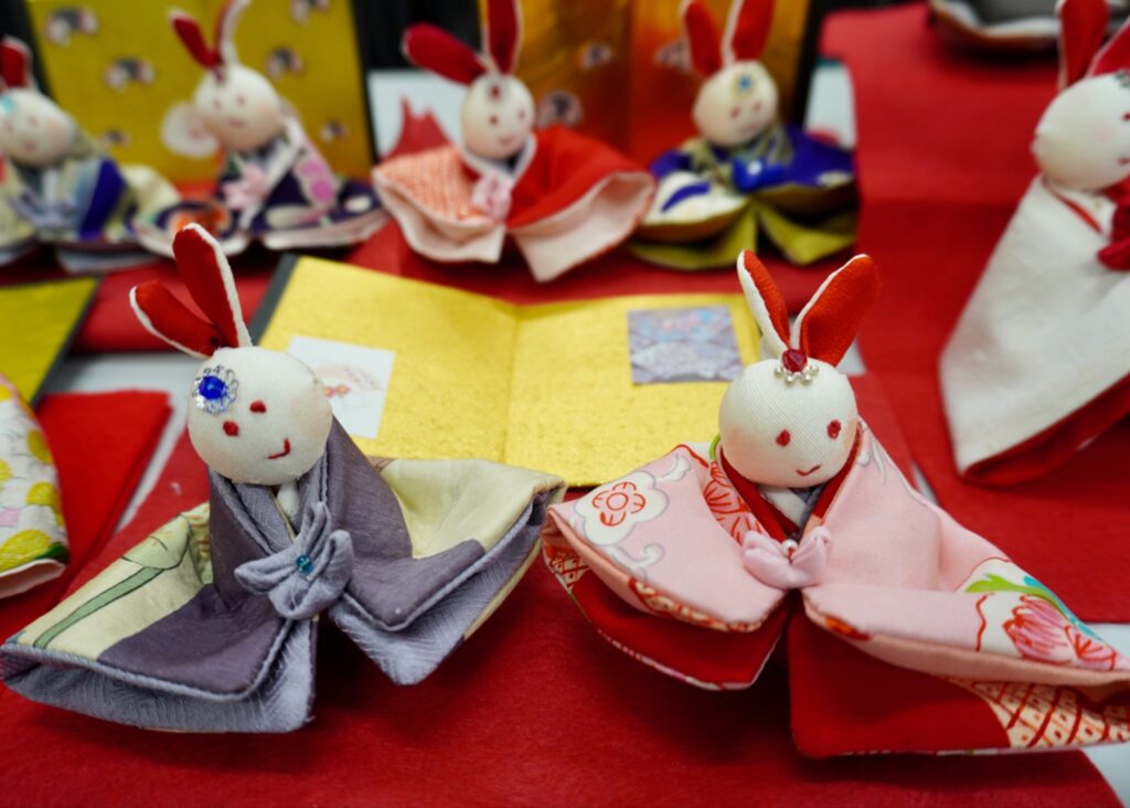 2月2日には、縁起の良い古布の晴れ着を使い、うさぎの親王飾りを作る1dayセミナー「古布からうさぎのおひなさま」が開催され、10人が受講しました。受講者の中には、親王飾りの他に三人官女を作る人もいました。