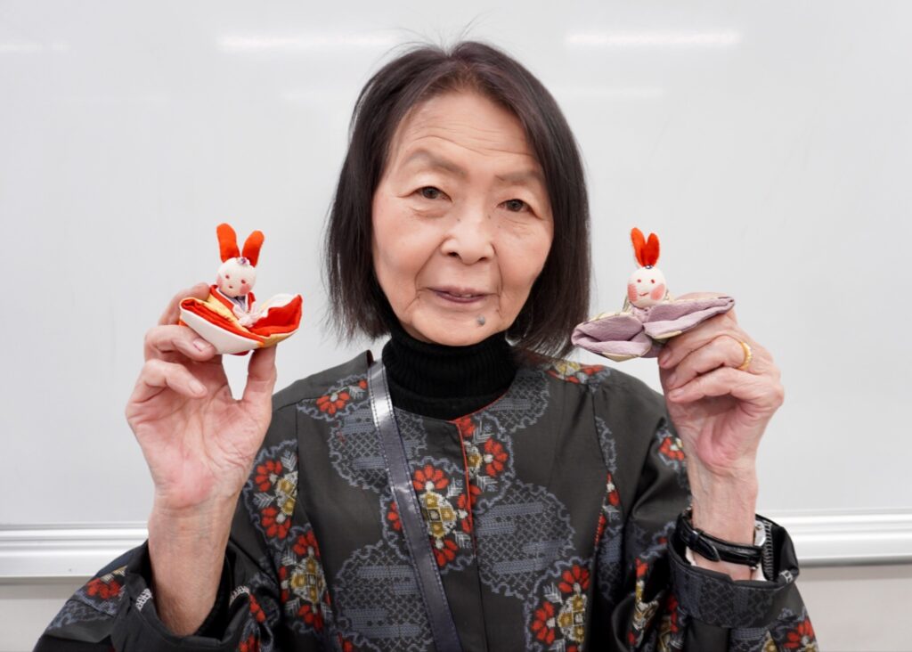 完成したひな飾りを前に、受講者らは「多少の疲れはありますが、楽しかった」と話し、自宅に飾る人、娘にプレゼントする人など、「うさぎのおひなさま」の行き先はさまざまのようです。皆さん、笑顔で完成したひな飾りを見つめていました。