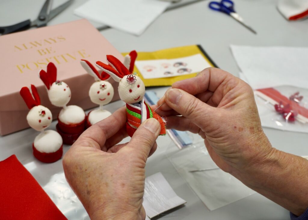 最後に縫い付けた着物を整え、うさぎの手元に花を縫い付けると「うさぎのおひなさま」の完成です。作業が思うように進まず困っている受講者の着物を工藤先生が整えると、見違えるほどの仕上がりになり、会場には笑顔が広がりました。