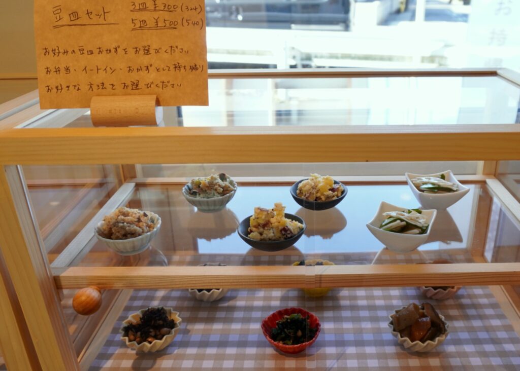 ショーケースにはメインと副菜が日替わりで約10種類が並び、弁当は3種類。少しづつ選べる豆皿セットも人気です。 中西さんは「やさしいお店づくりを目指しており、お惣菜を同じ容器にまとめてお渡しすることがあります。小さなエコにご協力ください」との呼びかけもします。