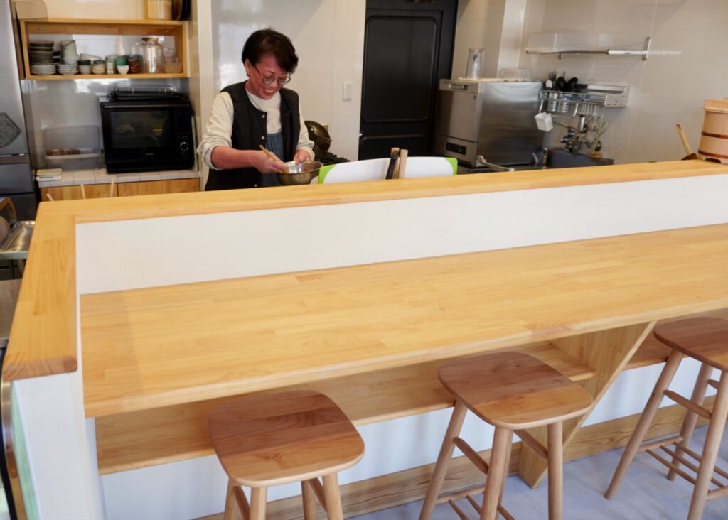 オープンから約半年。店には子育て中の人や高齢者など幅広い世代の人たちが訪れるようになり、常連客も増えています。店内には4席のカウンターがあり、会話を楽しみながら食事をすることもできます。