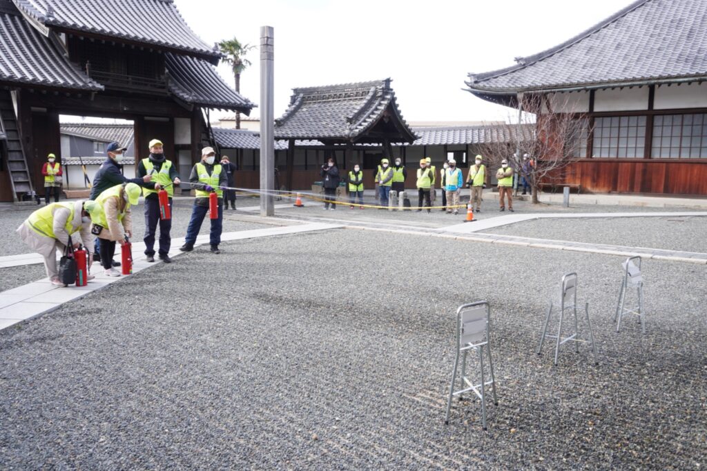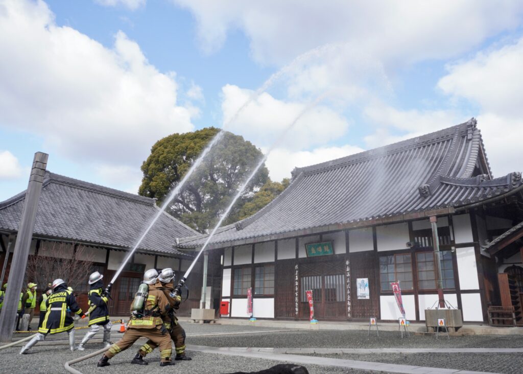訓練は地域住民が本堂前で出火を発見した場合を想定して実施され、「住民が初期消火を行ったが消火できなかったため、同寺関係者が119番に通報。到着した消防隊員に地域住民と寺関係者が現状を報告し、消防隊と鳴海消防団が放水で消火活動を行い無事に消火、終了」という流れで行われました。