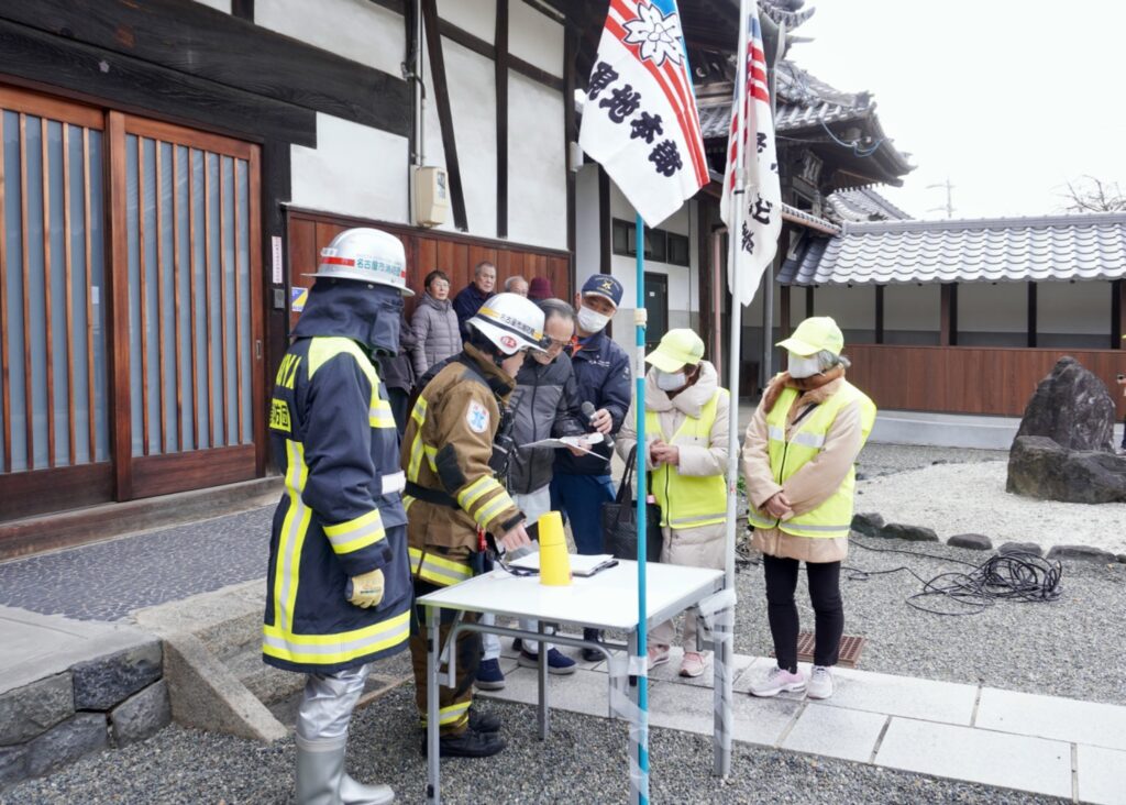 訓練後、緑消防署予防課の稲垣課長は「文化財は地域の宝です。火災を発生させない、大きくしないためには連携することが重要です」と協力を呼びかけ、鳴海学区区政協力委員会の福島伸明委員長は「いざという時は文化財を地域で守る必要があります。皆さんと一緒に見守り、この日のように臨機応変に動いてもらえたら」と話しました。