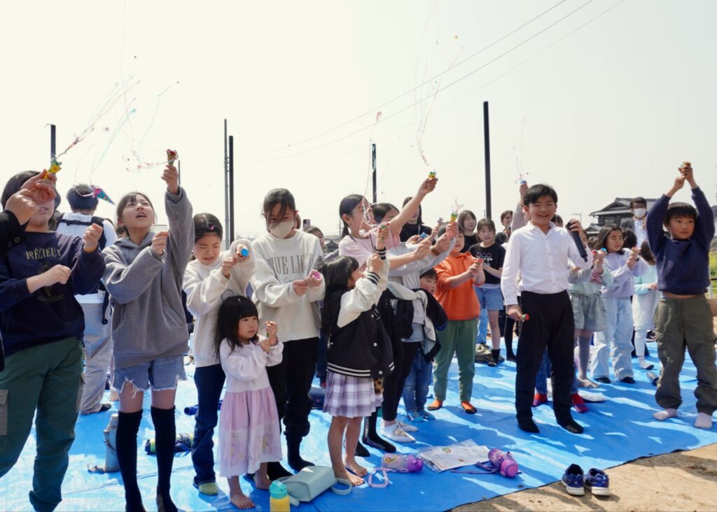 学童に所属する児童を代表して千佳さんと晄之介君が、地主の夫妻や建設に関わった人たちへ花束を贈りました。最後に「神の倉学童のうた」を合唱し、クラッカーを放ち開所式を締めくくりました。