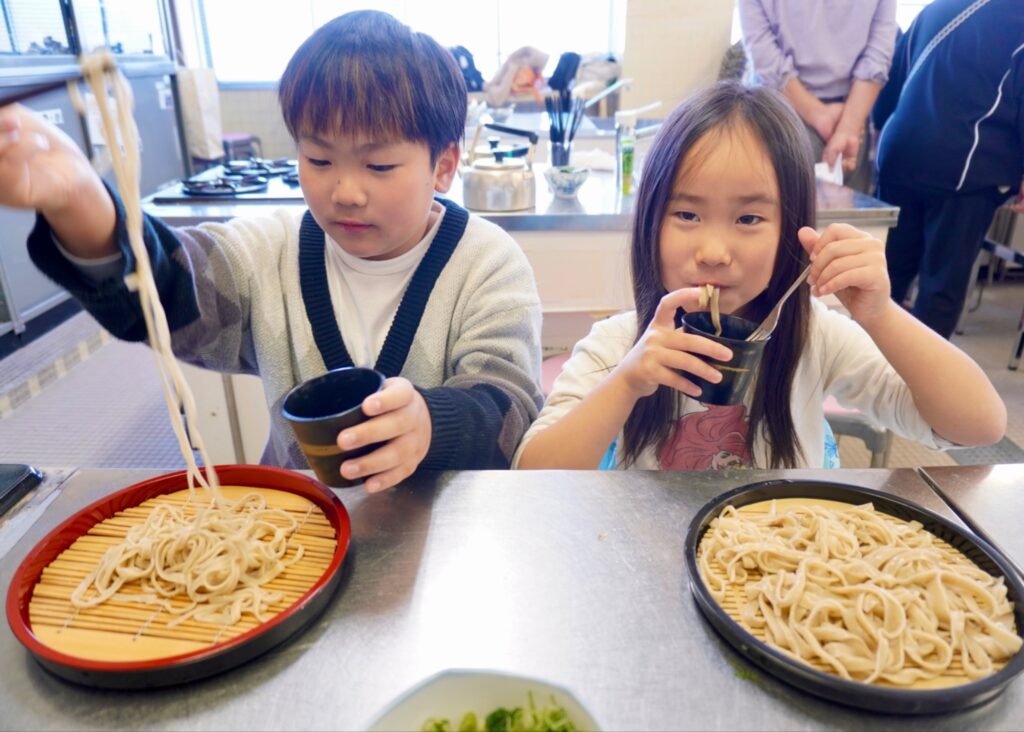 「みどり蕎麦打ちクラブ」と「そば打ち同好会緑」は、そば打ち体験教室を開催しました。そば打ちに初挑戦した宗寿君(9歳)と和蓮ちゃん(5歳)は、協力して生地をこね、伸ばし、切ってそばを作り上げました。ゆでて、出来立てのそばを味わった2人は、「楽しかった!おいしい!」と笑顔を見せていました。