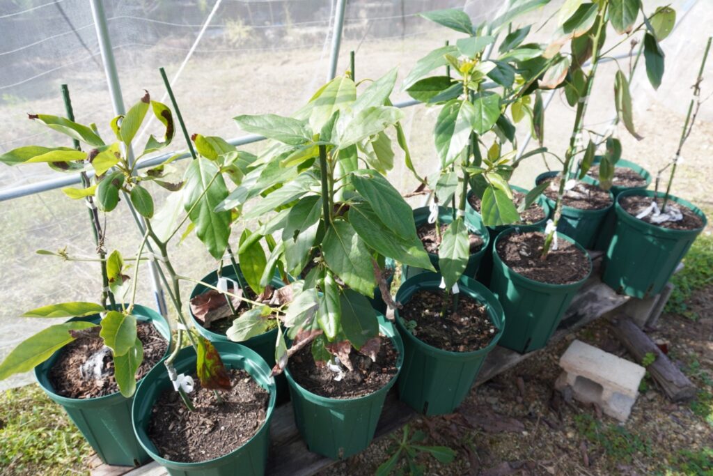 アボカドは中南米が原産といわれ、世界に3000以上の品種があるそうですが、その中でも深谷さんは、現在、「ベーコン」「ピンカートン」「メキシコーラ」という3品種を栽培しています。苗を育て、幹を太らせ、根を定着させるなどして、3年かけて木を育てます。4年目には実がなるように剪定し、樹形を整え、その後も虫よけのために袋がけを行います。また収穫後に追熟させるため、一度に全ての実を収穫します。昨年は約50個を収穫しましたが、中には400グラムを超えるものもあったといいます。深谷さんは「昨年、初めて実がなったときはうれしかったですね」と笑顔を見せ、今年も約30個の収穫を見込んでいるそうです。